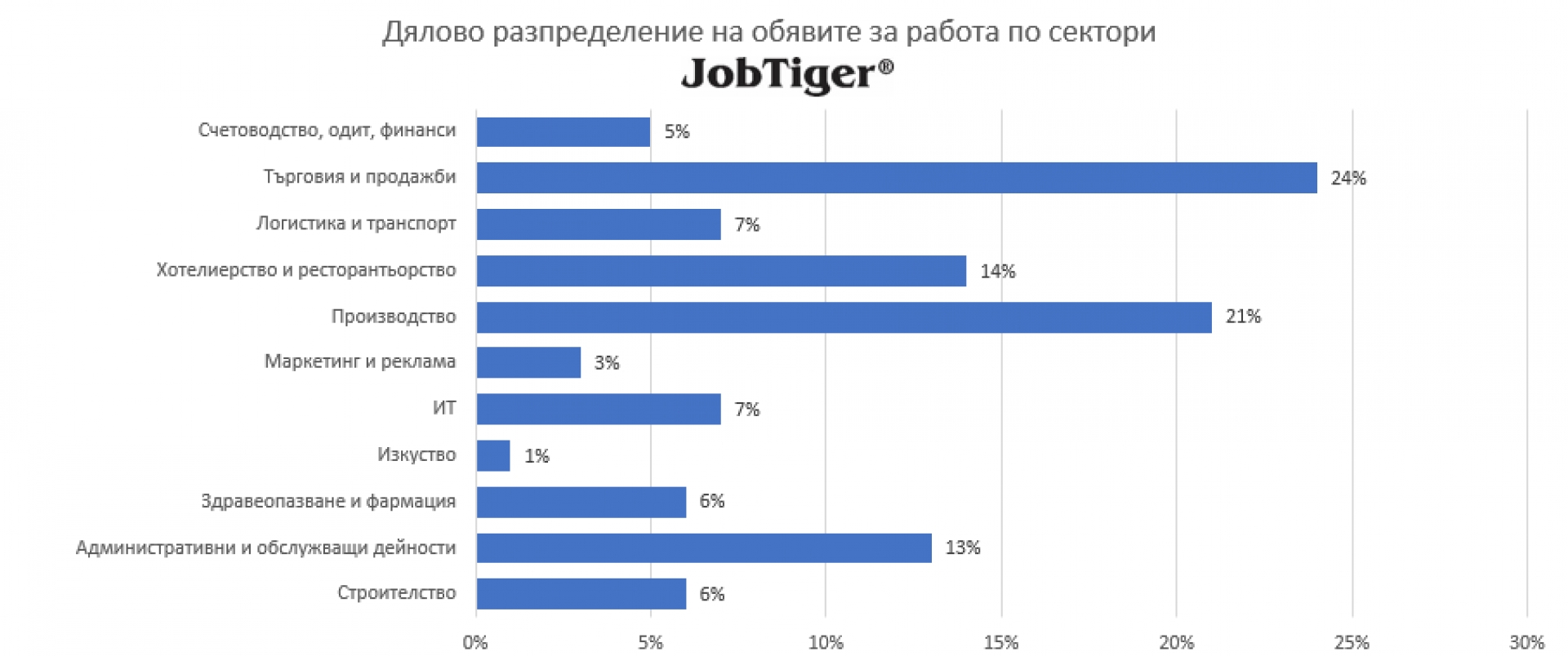 Според анализа на HR компанията и кариерен сайт JobTiger общият брой на обявите във водещите областни градове се е увеличил с 3 на сто, сравнено с януари месец. Динамиката във всеки един от тях е, както следва: София (1 на сто), Пловдив (1 на сто), Варна (1 на сто), Бургас (1 на сто), а при Русе и Стара Загора няма промяна.