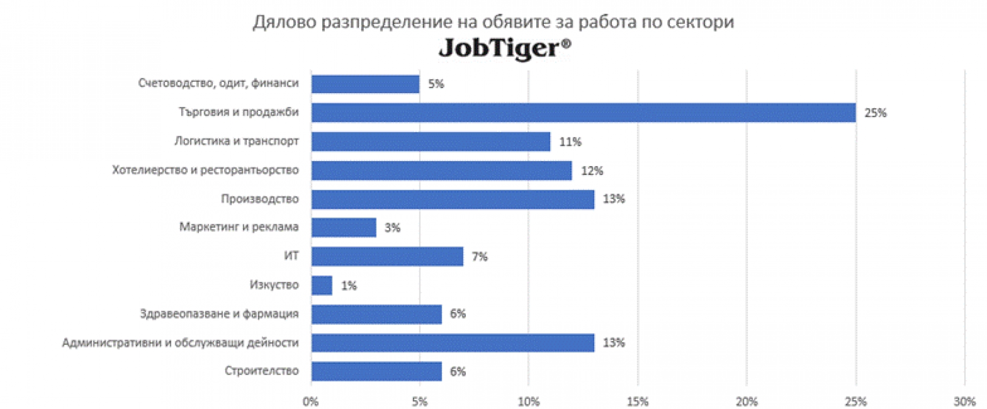 При статистиката на дяловото разпределение липсват значими размествания. Секторът „Търговия и продажби“ продължава убедително да доминира с 25 на сто дял на обявите. След него се нареждат секторите „Производство“ и „Административни и обслужващи дейности“, които този месец споделят равен дял от 13 процента. Секторът „Хотелиерство и ресторантьорство“ заема 12 на сто, което подсказва за стабилна активност. На следващо място е „Логистика и транспорт“ с 11 процента, продължавайки да играе ключова роля в поддържането на веригите на доставки. В останалите сектори е както следва „Информационни технологии“ (7 на сто), „Строителство“ (6 на сто), „Счетоводство, одит, финанси“ (5 на сто).