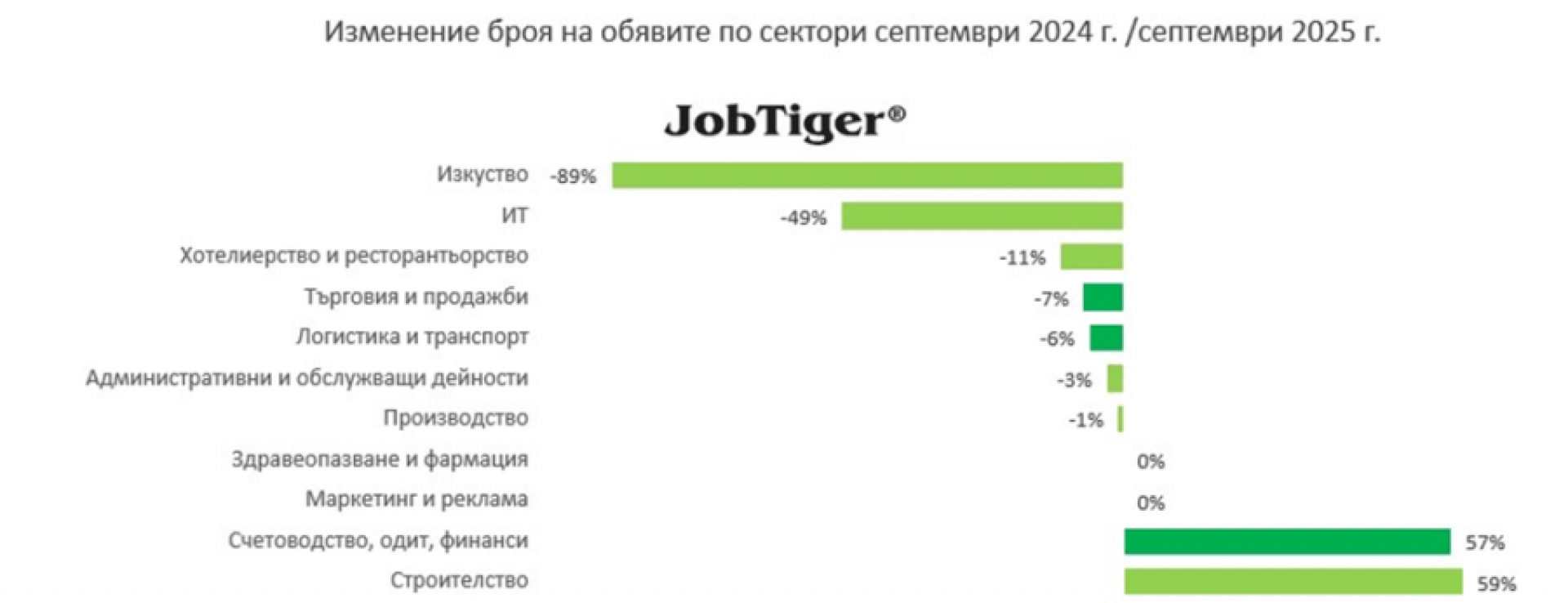 Най-съществено увеличение на обявите спрямо август е отчетено в секторите "Счетоводство, одит, финанси" - със 75 процента, "Строителство" - с 56 процента, "Административни дейности" - със 7 процента, "Здравеопазване и фармация" - с 11 процента, и "Търговия и продажби" - с 2 процента. Спад в броя на обявите се наблюдава в секторите "Информационни технологии" - с 3 процента, и "Хотелиерство и ресторантьорство" - с 10 процента, основно вследствие на приключването на летния сезон.
