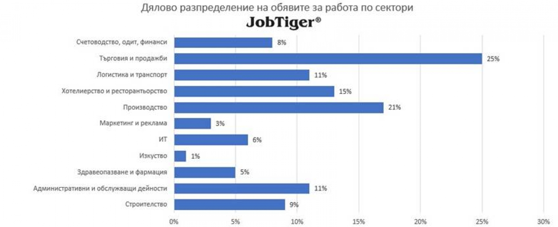 По отношение на дяловото разпределение, анализът не отчита съществени промени. Секторът "Търговия и продажби" остава водещ с 25 процента дял, следван от "Производство" - с 21 процента, "Хотелиерство и ресторантьорство" - с 15 процента, "Логистика и транспорт" и "Административни и обслужващи дейности" – по 11 процента, "Строителство" - с 9 процента, и "Счетоводство, одит, финанси" - с 8 процента. Следват секторите "Информационни технологии" - с 6 процента, "Здравеопазване и фармация" - с 5 процента, "Маркетинг и реклама" - с 3 процента, и "Изкуство" - с 1 процент.
